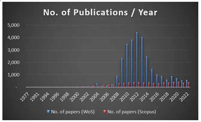 We can observe in the above chart that the largest number of papers on this topic was reported by Web of Science in 2012 (4.438 papers) and by Scopus in 2020 (438 papers).