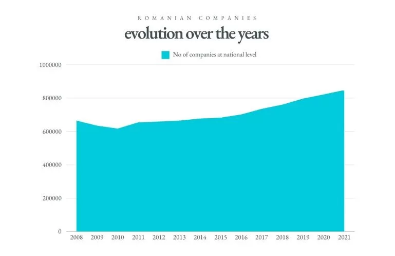 Over the past 14 years, 2008-2021, the number of companies in Romania has continued to grow from 662.803 as registered in 2008, reaching in the year 2021 the number of 845.728, which means a difference of 182.925 companies, equal 28% increase. The only downfall was registered during the economic crisis from 2008 and 2009. This may indicate a flourishing setting for economic activities and a greater appetite for entrepreneurial activities, influenced by the increased financial education and stability, governmental facilities, start-up programmes and sometimes economic necessities to supplement the income with additional revenue apart from the salaries.