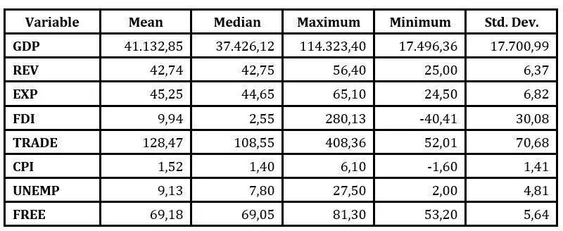 The determination of the research variables is in line with the previous studies presented in the literature review, these being mainly represented by: (a) the dependent variable (GDP) – natural logarithm of GDP per capita, signifying economic growth in the EU-28 countries, (b) the independent variables – government revenue as a percentage of GDP (REV), government expenditure as a percentage of GDP (EXP), foreign direct investment as a percentage of GDP (FDI), trade openness representing the sum of exports and imports of goods and services, measured as a percentage of GDP (TRADE), exchange rate, inflation rate (CPI), unemployment rate (UNEMP), and the index of economic freedom (FREE).
