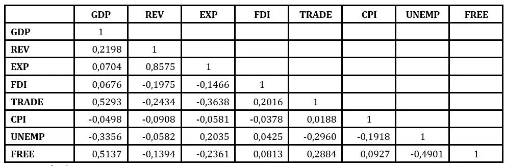 It is observed that there is a direct and strong correlation between government expenditure and government revenue, which is why in empirical estimations these two variables will be integrated separately, in distinct models. Additionally, it can be noticed the presence of direct and moderate correlation between the trade openness and GDP per capita, as well as between the index of economic freedom and GDP per capita, while the other correlations are weak.