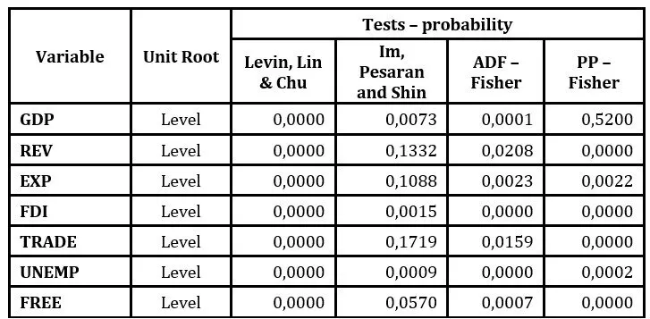 To test the existence of unit root, several stationarity tests were performed and, consequently, Table 3 presents the results of stationarity tests for each of the variables used in the empirical analysis, showing that the variables are stationary at level.