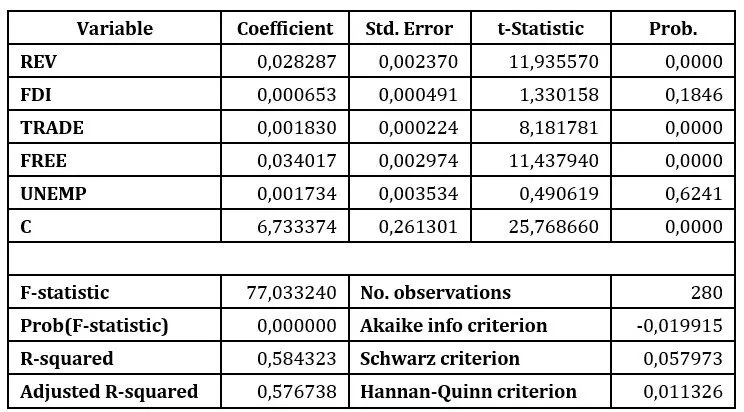 It is observed that there is a positive influence on economic growth exerted by government revenue, trade openness, and the index of economic freedom at a significance level of 1%. Thus, a 1 percentage point increase in government revenue spurs GDP per capita by 0,0283%; a 1 percentage point rise in trade openness leads to a 0,0018% increase in economic growth, while GDP per capita grows with 0,0340% if economic freedom increases by 1 percentage point. Nevertheless, foreign direct investment and the unemployment rate are statistically insignificant. Moreover, the coefficient of determination highlights that the government revenue, the trade openness, and the index of economic freedom explain 58,43% of the economic growth.