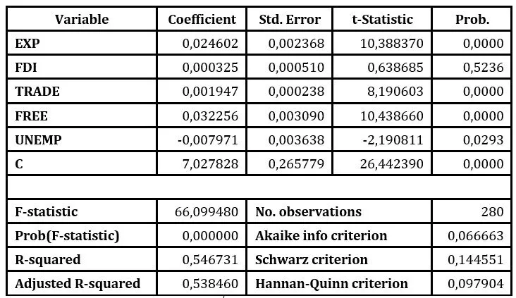 Economic growth is directly influenced by government expenditure, trade openness, and the index of economic freedom at a significance threshold of 1%, while the unemployment rate has a negative impact on economic growth at a significance level of 5%. Therefore, if the unemployment rate increases by 1 percentage point, GDP per capita decreases by 0,0080%. According to the coefficient of determination, the independent variables explain 54,67% of the economic growth.