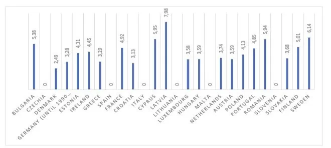 Figure 1 shows the percentage share of the information technology sector in GDP in 2018 in the European Union member states. Data were missing for the Czech Republic, Spain, Italy, Lithuania, Malta and Slovenia. The lowest share of the ICT sector in GDP is in Denmark and Germany. However, it must be taken into account that these are large and strong European economies in which the ICT sector is well developed. The highest value of the share of the digital sector in GDP can be boasted by Latvia and Sweden. The average for the entire European Union was 4.47%. Data from Eurostat.