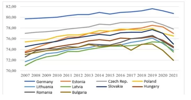 The life expectancy at birth index closely reflects the HDI rankings of the countries under comparison. Germany consistently ranks as the leader, recording the highest annual values, which underscores the international disparities in life expectancy. This trend highlights how countries with a high HDI typically achieve longer life expectancies, often due to the availability of high-quality healthcare services. Within the Bucharest Nine, the Czech Republic recorded the highest life expectancy in 2021, reaching 77.8 years, while Bulgaria reported the lowest, with an average life expectancy of 71.95 years.