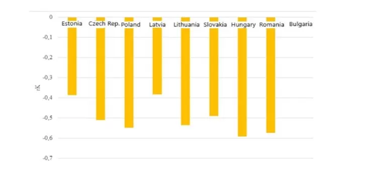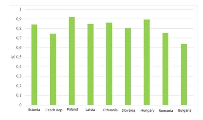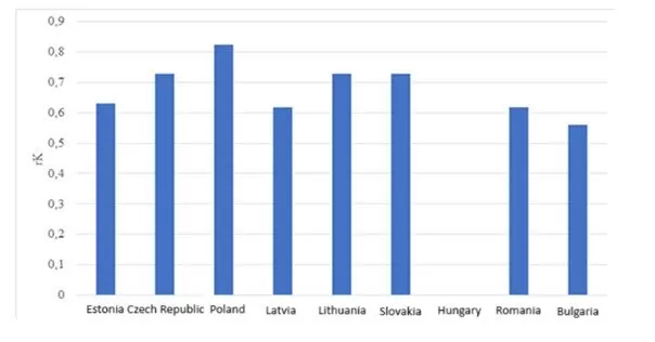 Compared to Germany (rK = -0.9712; p < 0.01), the structure of the results of the Bucharest Nine countries is homogeneous, which means that the observed ordinal correlation is weaker in all countries. The difference is always significant, as documented in the following Figure 13, but at the same time relatively balanced, as documented by the low value of the variation range of the results (R = 0.2094).