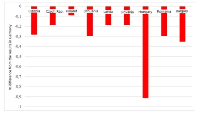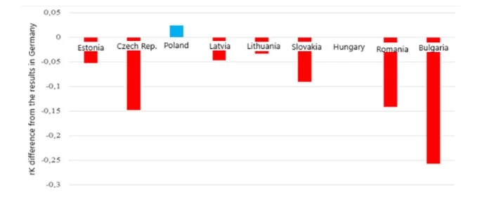 In no case, however, do the results of the Bucharest Nine countries reach the level of the Kendall coefficient in Germany (rK = 0.9135; p < 0.01). Poland is closest to this (rK = 0.823; p < 0.01), followed by three countries with the same results, i.e. the Czech Republic, Latvia and Slovakia (in all cases rK = 0.7273; p < 0.01). The largest differences were demonstrated when comparing with Bulgaria (rK = 0.5604; p < 0.01) and Romania (rK = 0.6190; p < 0.01). The difference in the results of individual countries with the result of Germany is also shown in more detail in the following Figure 9.