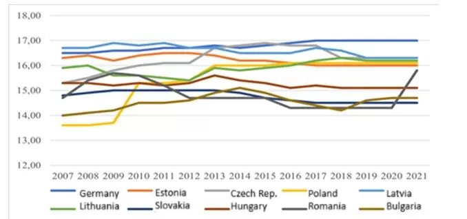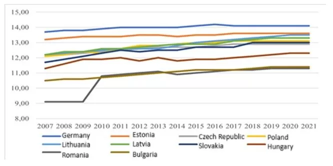 We averaged the figures from Figure 3 and created a sequential ranking consisting of the Bucharest Nine countries and Germany, the following order: Germany – 14.00 years, Estonia – 13.47 years, Lithuania – 12.87 years, Latvia – 12.84 years, Poland – 12.77 years, Czech Republic – 12.64 years, Slovakia – 12.53, Hungary – 11.93 years and the lowest age belongs to Bulgaria – 11.02 years and Romania – 10.69 years. It should be noted in particular that the comparator country Germany has a wide network of public schools and universities, which are generally accessible to all residents regardless of their financial capabilities.