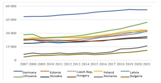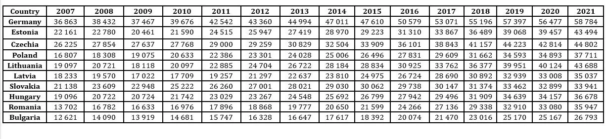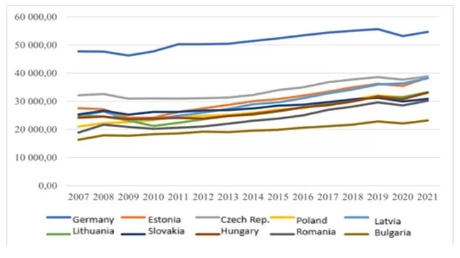 Table 2 shows the gross domestic product for the monitored countries of the Bucharest Nine and, for comparison, the leader of Western Europe, Germany, for the period 2007-2021.