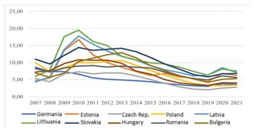 At the beginning of the period under review, the average registered unemployment rate in the Bucharest Nine was 7.04%. Figure 5 shows that, after the economic crisis in 2009, unemployment increased in all the Bucharest Nine countries in the following years. The highest unemployment rate was recorded in 2010 and throughout the entire period under review. Fortunately, due to the economic recovery, the unemployment rate decreased. The lowest measured unemployment rate in the Bucharest Nine was in the Czech Republic in 2019. The highest value of the registered unemployment rate was measured in Latvia in 2010. Using graph no. 7, we can conclude that the Czech Republic, with a value of (2.80%), in 2021 overtook the Western European leader, Germany, with a value of (3.60%), in terms of registered unemployment.