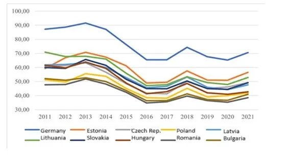 Figure 7 shows the development of the cost-of-living index for the period 2011 to 2021 due to the absence of data in Numbeo statistics. From graph no. 10 we can conclude that the cost-of-living index has been decreasing over the years. The leaders of the B9 with the highest measured value are Estonia, which ranks 98th, together with Latvia, which ranked 89th in the CPI ranking in 2021. This is followed by the Czech Republic, which ranked 73rd, and Slovakia, with 72nd place in the CPI ranking in 2021. This is followed by Lithuania, which ranked 69th, Hungary with 65th place, and Poland with 61st place in the aforementioned ranking. On the contrary, during the monitored period, the lowest values in the cost-of-living index were shown by Bulgaria, which ranked 55th with its values, and Romania, with 46th place in the CPI ranking in 2021. Figure 7 also shows us the different values between the Bucharest Nine group and the western state of Germany, where the country ranked 110th in the 2021 CPI ranking. In general, the cost of living in Germany is relatively high compared to other countries.