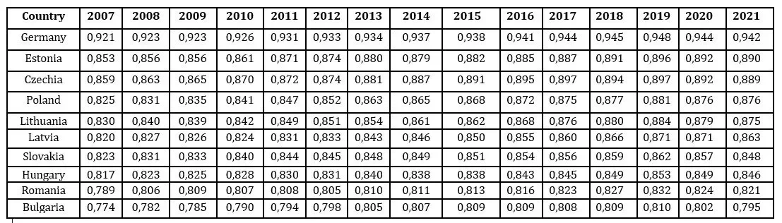 The primary objective is to compare international differences in the quality of life using the Human Development Index, focusing on the B9 countries over a defined period. The Bucharest Nine consists of the following countries: Poland, Bulgaria, Romania, the Czech Republic, Estonia, Hungary, Latvia, Lithuania, and Slovakia. For comparative purposes, we have selected Germany, the leader of Western Europe. The required data and information will be collected for the period from 2007 to 2021.”
