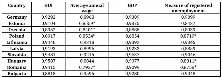Based on the obtained results, we can conclude that, with the exception of Hungary, a statistically significant relationship between the human development index and the average wage has been demonstrated in all other Bucharest Nine countries, meaning that H1 can be confirmed. However, when compared to the strength of this ordinal relationship in Germany, we observe significantly lower values of the Kendall coefficient. Differences can also be observed within the Bucharest Nine countries, with Poland coming closest to the results of Germany.