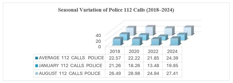 Based on Table 2 and Figure 3, a comparative analysis was carried out to assess seasonal differences in police-related emergency calls across selected years, using January as a low-tourism reference point. The variation between the two months was calculated with the percentage difference formula, (August Volume − January Volume) / January Volume × 100. The results show that, on average, police calls were 38.5 percent higher in August than in January, underscoring the pronounced seasonal effect of tourism on emergency demand patterns.