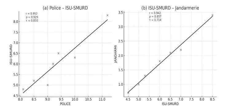The analysis revealed strong and statistically significant relationships. Police and ISU-SMURD (emergency rescue) calls were highly correlated (Pearson r = 0.952, p < .001; Spearman ρ = 0.929, p = .007; Kendall τ = 0.810, p = .011), indicating that an increase in police calls was consistently associated with higher ISU-SMURD demand.