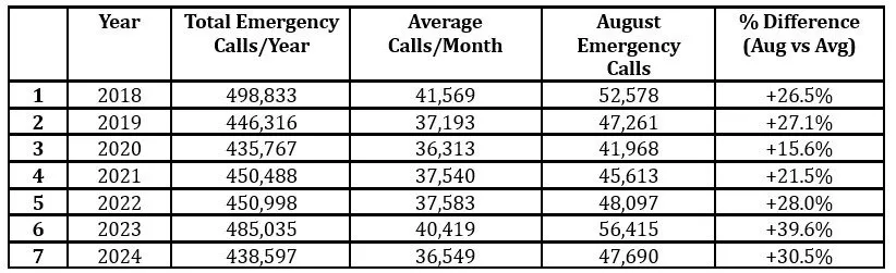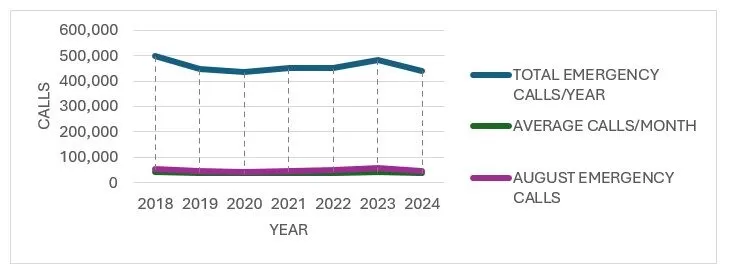 Table 1 provides the numerical evidence of annual call volumes and seasonal variation, while Figure 1 visually illustrates these trends over time. Taken together, they show not only the relative stability of yearly totals but also the recurring spikes in August, which stand out clearly in the graphical representation.