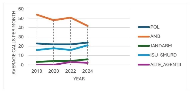 Figure 2 provides a comparative analysis of emergency call volumes across different agencies for the years 2018, 2020, 2022, and 2024, in Constanța County. The findings reveal an overall increase in the number of emergency calls received by the police, gendarmerie (Jandarmeria), and ISU-SMURD. In contrast, ambulance service calls have experienced a slight decline, while calls directed to other agencies have shown a marginal increase.