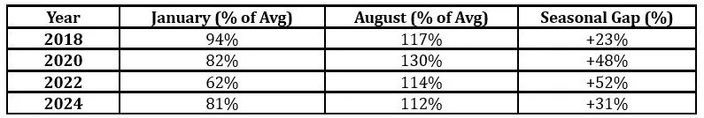 Table 1 summarizes the annual totals and seasonal differences, whereas Figure 1 offers a graphical view of the same data, clearly highlighting the peaks in August compared with the monthly average.