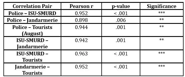 Inter-agency coordination was also evident: ISU-SMURD and the gendarmerie showed strong correlations (r = 0.942, p = .001; ρ = 0.857, p = .024; τ = 0.714, p = .030), suggesting frequent co-involvement in incident response. Finally, gendarmerie calls increased with tourist numbers (r = 0.952, p < .001), although nonparametric measures were weaker (ρ = 0.714, p = .088; τ = 0.619, p = .069), indicating that while tourism elevates gendarmerie activity overall, the trend is less consistent.