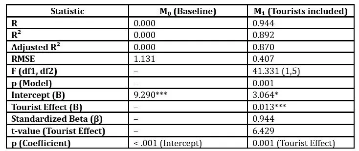 Note. M₀ = baseline model (intercept only); M₁ = model including Number of Tourists (August). Source: Author’s own calculation based on STS and INSSE data (2018–2024).