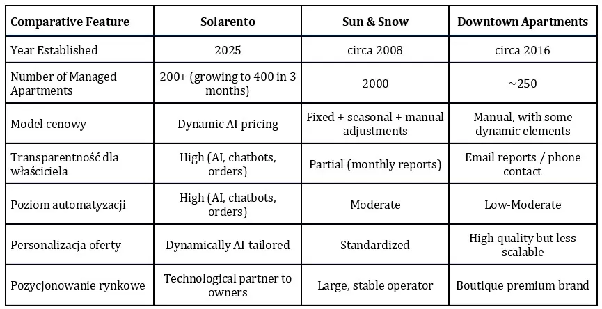 Table 1: Comparative Overview of Short-Term Rental Operators: Solarento, Sun & Snow, and Downtown Apartments
