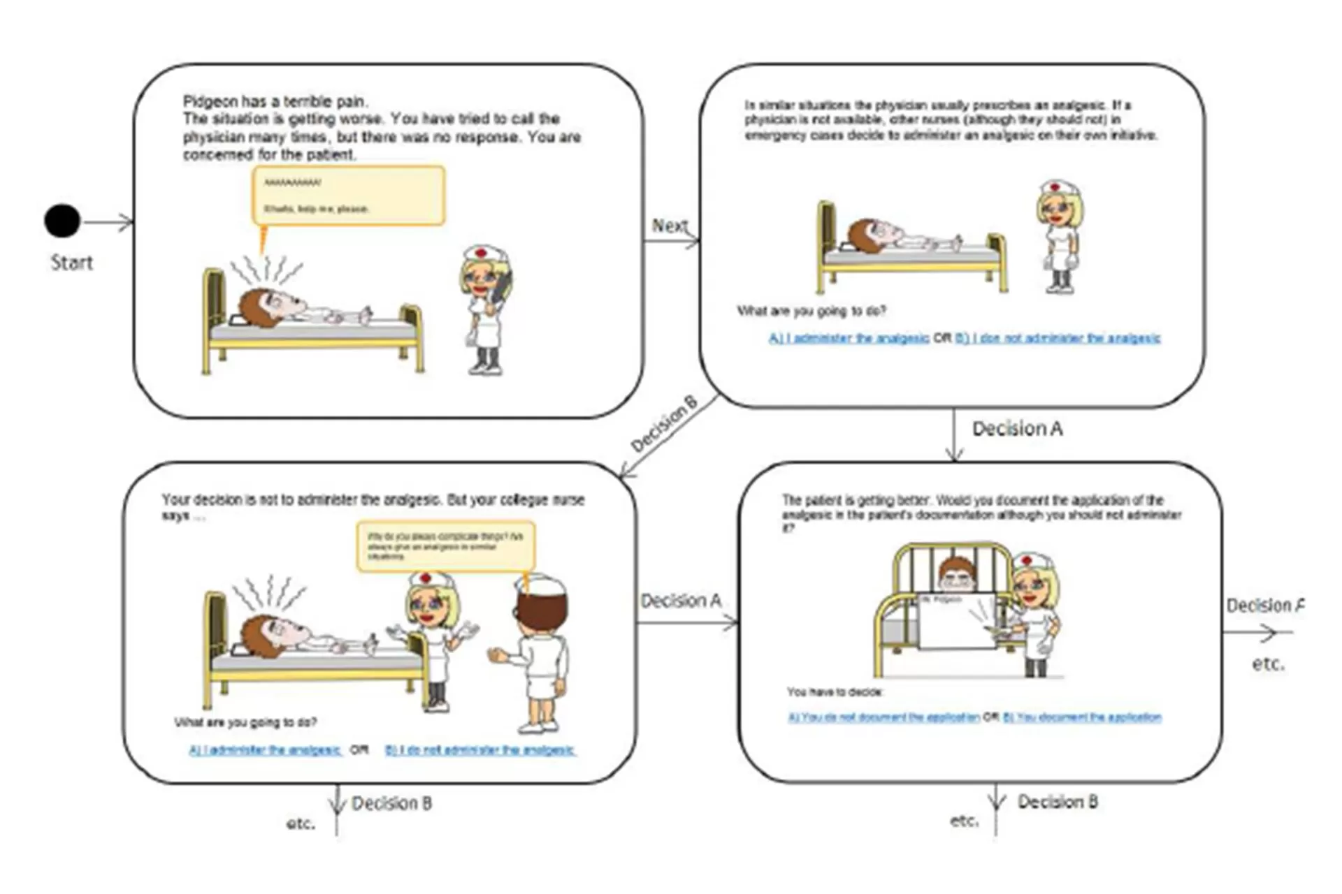 Our approach for developing CT skills is based on scenarios representing different clinical situations by using different ICT resources: e.g. on-line comics, videos, virtual, and augmented reality. A scenario consists of different situations presenting various dilemmas, i.e. a problem that offers two possibilities (Metcalf & Yankou 2003). Each situation’s possibility leads to a new situation without a clear solution, where students are faced with the consequences of their previous decisions. The example a scenario is presented as state diagrams in figure 1. The e-contents based on the presented approach always lead to new unfavourable situations. According to Doane (2002), a student should be invited into the abyss, into the difficulties that are part of the nursing practice. Students should grapple with the uncertainty and ambiguity, which is present in health care practice. The facts that each decision is incorrect lead the student to think twice about the situation and to reconsider possible consequences. Unfortunately, this uncertainty is often present in our everyday lives.