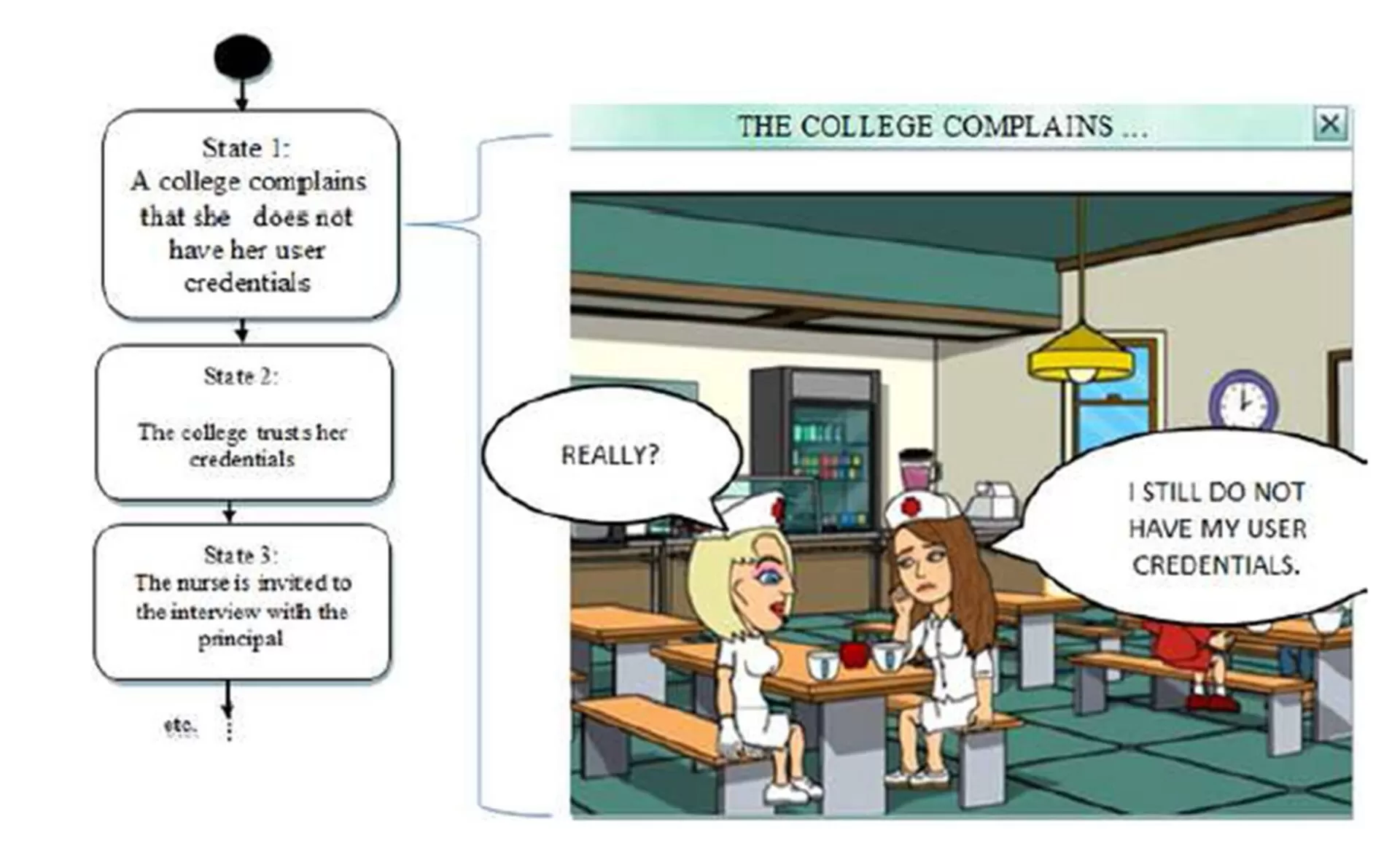 Some students decided to improve the attractiveness of their e-contents with the use of web application BitStrips (n.d.). The application was used to create different characters, situations and objects in order to make the situations more vivid. The scenarios were presented as UML state diagrams, where each page of the developed e-content represents a concrete situation in a developed e-learning content, similarly as in section 2.1. In the continuation is presented an example of a student’s content where potential risks for information security violations are presented as real scenarios. The student identified the scenarios during interviews with two IT experts, which presented some exemplar situations of the information security violations from their past experience (Rošeto 2013). Accordingly, using the aformentioned tools, five scenarios were developed: personal data abuse, abuse of credentials, communication of personal data through phone, surfing the web on the hospital computers, and infected USB stick. These scenarios were validated by two IT and healthcare experts and presented to nurses in an institution. An excerpt of the e-content abuse of credentials is presented in figure 2.