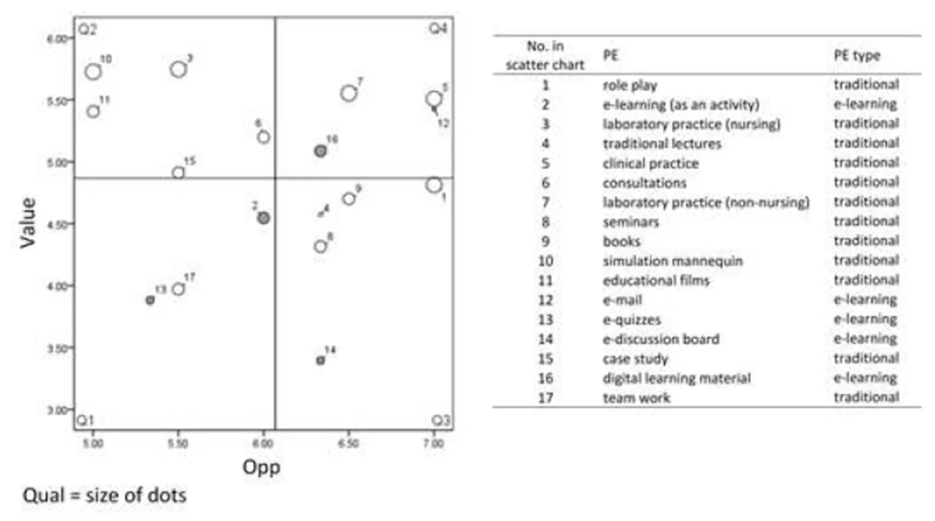 The results of one of these evaluations is shown in figure 3. The results are presented on a scatter plot divided into four quadrants (Q1-Q4). Each dot on the scatter plot represents a single PE marked by a unique number. Grey dots represent e-learning PEs, while white dots represent traditional PEs. The size of each dot represents the Qual dimension, horizontal axis represents the Opp dimension and the vertical axis represents the Value dimension. In order to improve the pedagogical process, teachers and management should focus primarily on the PEs that have a considerable positive impact on the quality of knowledge and are positioned in either Q2 or Q3. For the PEs in Q2 (e.g., Figure 3, PE 10), teachers and management should investigate whether it is possible to alter the pedagogical process to create more opportunities for the use of such PEs or to introduce new similar PEs with more opportunities for use. In the case of the PEs in Q3 (e.g., Figure 3, PE 8), further investigations are required and actions should be taken to improve their value for students by either properly presenting them to the students or by replacing them with PEs that are more acceptable from the students’ perspective. Different actions should be taken for the PEs in Q1 (e.g., Figure 3, PE 13). These PEs neither have high value for students nor high opportunity for use. Consequentially, teachers should determine whether these PEs can be replaced by other PEs or removed from the pedagogical process. Finally, the PEs in Q4 (e.g., Figure 3, PE 5) that have high opportunity for use and value for students should be periodically monitored in order to identify significant changes of their position.