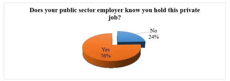 The findings indicate that among the multiple jobholders in the public health care sector, 76% of their employers know they hold the jobs while 24% of them have preferred to moonlight privately without informing their public health sector employer. Nevertheless, for those practitioners who held private jobs with the knowledge of their employers, the researcher asked them to indicate how their public sector employer felt about them holding that job. Respondent 2 responded as follows: “All medical specialists are given Official part-time license to practice privately”.