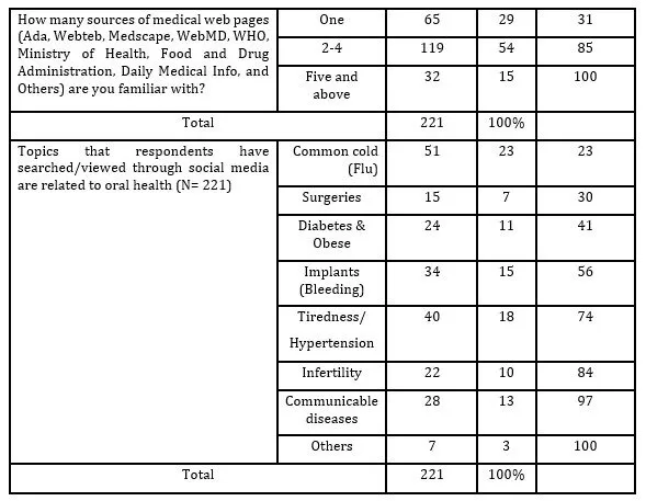 Considering the frequency of social media for health-seeking information, 45 (20%) respondents claimed that they search to get oral healthcare information on social media platform(s) daily, followed by Weekly and BI-weekly 124 (56%), Monthly 22 (10%), Quarterly 19 (9%), and Yearly 11 (5%). From a list of sources of medical web pages provided in our questionnaire (Ada, Webteb, Medscape, WebMD, WHO, Ministry of Health, Food and Drug Administration, Daily Medical Info, and Others), 216 respondents (98%) were familiar with at least one of them. Lastly, the table indicates the health-related topics that respondents have searched/viewed through social media.