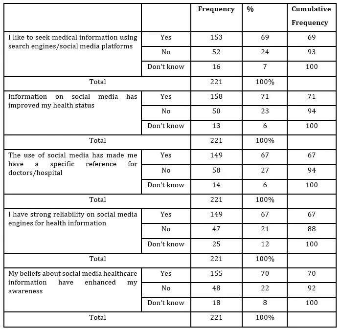Participants’ perception of healthcare information via social media shows in Table 3. Out of 221 participants, 153 (69%) respondents like to seek medical information using search engines/social media platforms. 71% of the participants believed that Information on social media had improved their health status. More so, 67% of the participants indicated that the use of social media has made them have a specific reference for doctors/hospitals. Approximately 67% reported that they have strong reliability on social media engines for health information. Lastly, 74% claimed that their beliefs about social media for healthcare information had enhanced their awareness. By implication, participants often use social media for medical consultations, and more importantly, the online information provided by physicians is useful.