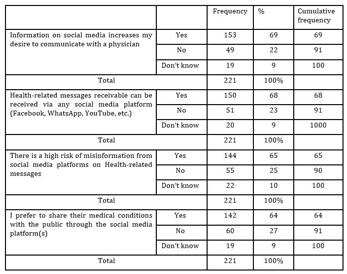 Participants’ awareness and attitude towards social media usage show up in Table 5. Among 221 respondents, 69% expressed that information on social media increases their desire to communicate with a physician, and 38% of the participants indicated that health-related messages are receivable via any social media platform (Facebook, WhatsApp, YouTube, and others). However, 65% of the respondents affirmed that there is a high risk of misinformation from social media platforms on health-related messages; while 64% prefer to share their medical conditions with the public through the Internet.