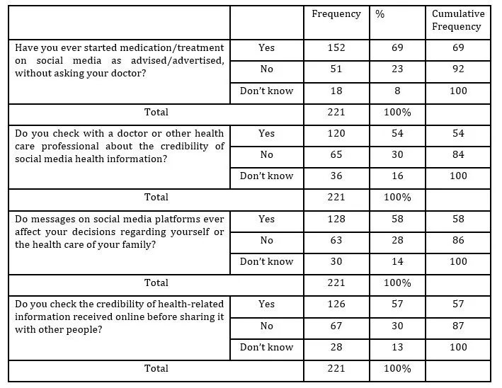 The participants’ other uses of social media usage are presented in Table 6. The majority (69%) of the participants expressed that they start medications/treatment as advised/advertised on social media without asking their doctor. This result bolsters the danger of seeking unverified information on health-related issues via social media. Approximately 54% believe that they verify the credibility of healthcare information on social media with a doctor or other healthcare professionals. In contrast, only 58% claim that social media platform messages ever influence their decisions about themselves or the health care of their family. Ultimately, 57% of the respondents also indicated that before sharing it with other people, they would check the integrity of health information. The number of respondents who check the authenticity of health-related information obtained via social media is, by definition, slightly above average. This finding raises considerable concern.