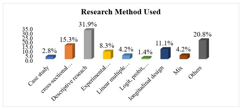 It was revealed that the majority of the studies that were done based on the subject ‘dual practice’ used the descriptive research design (31.9%). This was followed by other methods that were used represented by 20.8%, while cross-sectional design was noted to be used by 15.3% of the studies. This means that the majority of investigations on DP have recognized the significance of explanatory study methodology. The conclusions are congruent with the findings of Nassaji (2015), who recognized descriptive study architecture as a credible strategy for exploring particular themes and as a forerunner to larger quantitative investigations. Although there are some legitimate issues regarding statistical significance, provided the scientist understands the limits, this sort of experiment is a useful scholarly instrument. This research focuses on what happened rather than how or why it happened. As a result, evaluation and assessment procedures are frequently utilized to obtain statistical findings/information (Gall et al., 2007). In such investigations, information may be obtained subjectively but is frequently objectively evaluated using counts, percentages, probabilities, or other probabilistic approaches to determine correlations. However, subjective research is more methodical and frequently necessitates a thorough gathering of information from numerous perspectives to gain a better knowledge of specific respondents’ ideas, emotions, and perspectives. A qualitative study analyzes knowledge in a comprehensive way, including the use of content and narrative to expound to the outcomes of a particular survey.