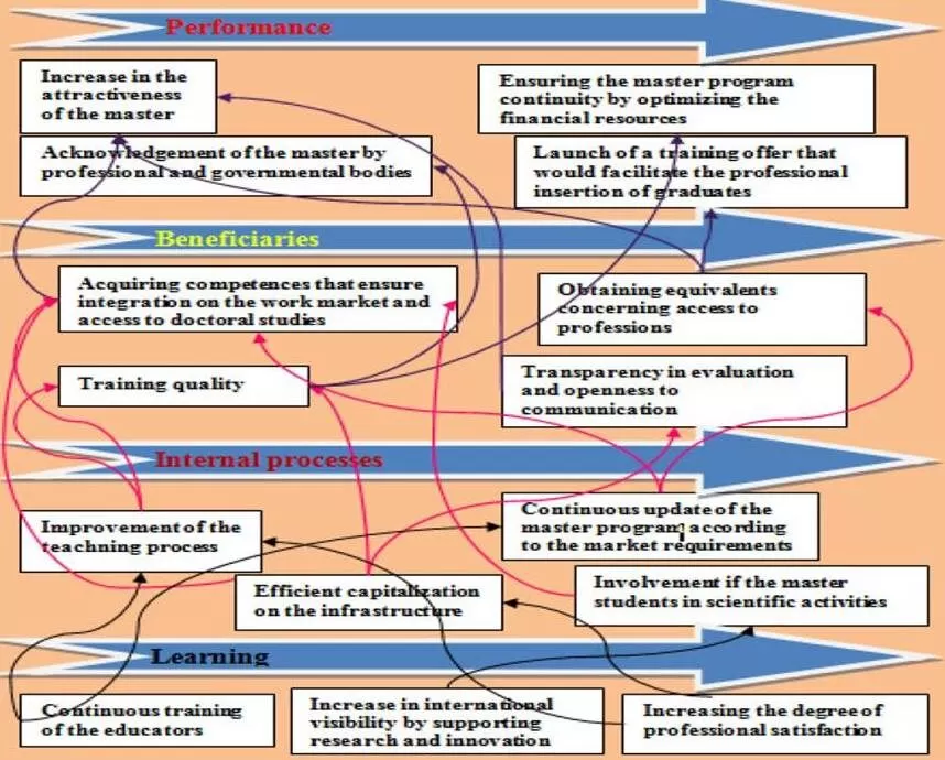 Following the application of a Balanced Scorecard within a master program, the main connections between the various objectives corresponding to each axis have been identified (performance, beneficiaries, internal processes, learning), with the purpose of justifying the empirical analysis of the dependencies stressed by the general hypothesis. By validating the five work hypotheses, we can draw the conclusion that the evaluation of the performance of a master program is a complex and dynamic process, but the improvement of university transparency and infrastructure, the use of information technologies and the modernization of the school curriculum are some of the factors that significantly contribute to increasing the academic performance. Obtaining this BSC induces an iterative process of observation, evaluation and decision-making with the purpose of continuously improving the master program.