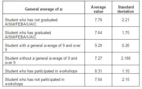 According to the obtained results (Table 1), we can notice that certain factors contribute to university performance, reflected in the general average of a student after the first year of master. It is very important that the general average of a student after the first session of exams, who has not graduated from the Accounting and Information System Management (AISM) program of the faculty organizing the AEA master program, is higher compared to that of a student who has graduated from this specialty, which implies that the master program provides the essential knowledge for acquiring a specialty culture, irrespective of the previous background of the student, and the accessibility of the classes reflects a high degree of performance of the master program. Another relevant element consists in the fact that the students’ presence in workshops significantly contributes to obtaining better results, through the practical nature of such participation, compared to the students who have never taken part in such activities.