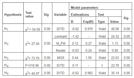 Taking into account the variables introduced in the analysis for each work hypothesis, estimations of the model parameters have been obtained. These (the coefficients of the variables in the model) are tested using the Wald and t(Student) statistics in order to determine the degree of usefulness and significance of the parameter within the suggested model. Moreover, based on Sig, compared to the threshold of 0.05, we can state with a confidence of 95% that the parameters of the models in the five work hypotheses are valid and significant.
