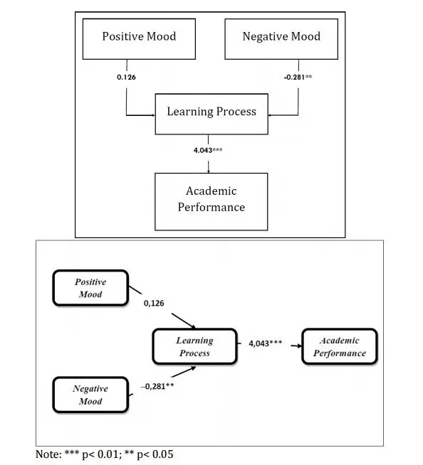 The independent variables’ correlation, i.e., positive mood and negative mood, reveals that there is no severed multicollinearity, because the value (-0.390) is still below the maximum value, i.e., 0.80, which indicates the existence of multicollineartiy (Gujarati, 1995). The significant and positive correlation between positive mood and learning reveals that students’ positive mood will influence his/her readiness to face the examination through various learning processes. Meanwhile, students’ well-learning process will proceed to good examination results, as proved by the positive and significant correlation between learning process and academic performance.