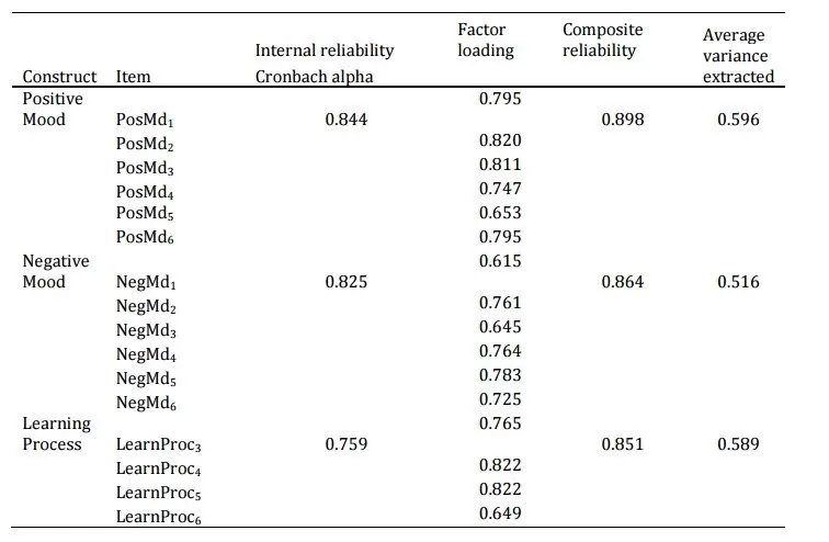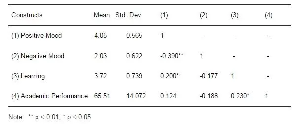 In this study, positive mood and negative mood are independent variables. There are six items used to measure each positive mood and negative mood, respectively, in 5-Likert scale (5: strongly agree, 4: agree, 3: neutral, 2: disagree, and 1: strongly disagree). There are also six items used to measure learning process which measure self-reported students’ learning process, in 5-Likert scale (5: always, 4: often, 3: seldom, 2: rarely, and 1: never), such as student’s presence rate, assignment submission, reading pre-presence, self-practice lecture materials at home, discussing lecture material with friends, and consulting with lecturer before and after the class. Meanwhile, to measure the academic performance, the midterm examination result is used. The authors distributed 116 questionnaires and there were 106 usable-questionnaires or 86% response rate. The descriptive statistic reveals results as follows: