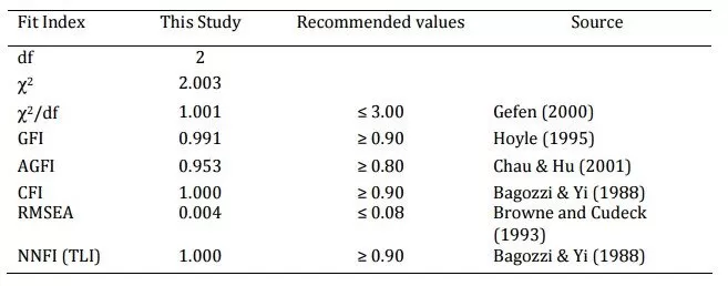 The next step is to measure the validity and reliability of all items in the proposed constructs by using AMOS 16. From this process, there are two invalid items in learning construct. The validity and reliability test reveals that only two items of the learning process construct are not reliable, i.e., LearnProc1 and LearnProc2, which have Cronbach’s Alpha value and factor loading below the minimum value 0.60 (Gujarati, 1995). Meanwhile, to test the construct validity, it used three approaches of convergent validity, i.e., factor loading, composite reliability, and average variance extracted. Standardized loading estimates should be 0.5 or higher, and ideally 0.7 or higher. In this study, all valid constructs have factor loading more than 0.5. Average variance extracted (AVE) estimates for two factors also should be greater than the square of the correlation between the two factors to provide evidence of discriminate validity. AVE should be 0.5 or more to suggest adequate convergent validity, and in this study, all valid constructs have AVE value more than 0.5. Meanwhile for composite reliability, the construct reliability should be 0.7 or higher to indicate adequate convergence or internal consistency, and in this study, all valid constructs have composite reliability value more than 0.7. Therefore, it can be said that all constructs used in this study are valid and reliable.