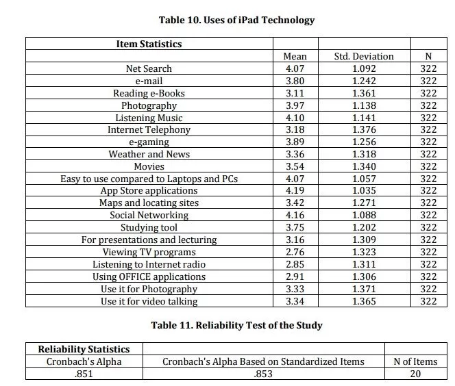 After collecting the most frequent uses during the pilot study stage, we built our research instrument. We were able to collect 345 items. Table 10 is list of most used purposes of the iPad technology by the Kuwait University students. In order to test the reliability, we ran the reliability test and found the Cronbach Alpha = .853 (see Table 11), which is scientifically approved.