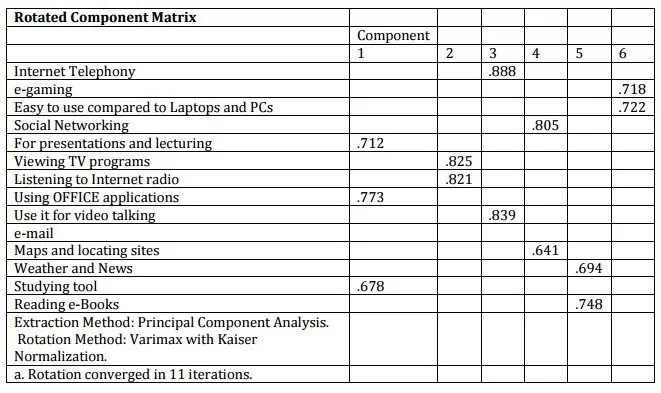 The factor loadings are presented in Table 12. The variance initially was low (σ2 = 63). Then we refined the test and ran it by taking out some constructs. The total variance explained is σ2 = 71.384 with 14 constructs only. Table 12 presents the factor loading of the most frequent uses of the iPad technology by Kuwait University Students. Note that we took out some uses due to the poor loadings. Clearly from the factor loadings we find that the uses are loaded over 6 factors. The factors can be named as 1) office uses (for presentation and lecturing, using OFFICE applications, and studying tool), 2) media (viewing TV programs and listening to Internet radio), 3) synchronous communication (Internet telephony and video talking), 4) social gathering (social networking and locating sites), 5) Knowledge tool (News and reading e-books), and finally 6) entertainment (e-gaming and easy to use).