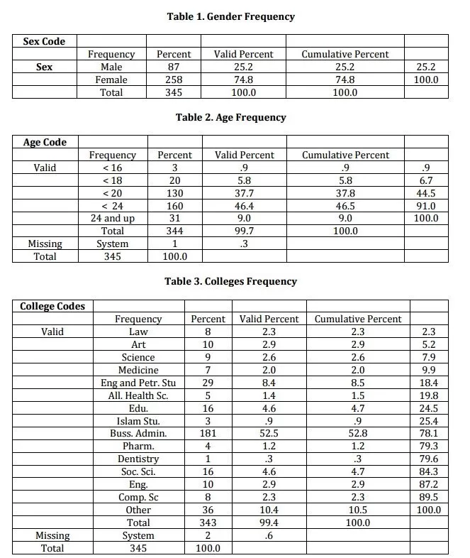 The sample study of our research is 345 of Kuwait University students. Students belong to different colleges and many backgrounds. As we explained in the previous discussion, our concentration over Kuwait University students due to the strategic plan by the administration to equip all students with this technology. Therefore, we concentrated our study over students from different colleges.