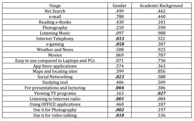 Moreover, the association chi-square test shows that there are dependencies between sex and seven usages and only one use has significant Chi-square p-value against academic background. This means that all tablet uses are indifferent for our sample study according to their academic background except for viewing TV programs, where we found that there some significance. However, gender was significant against many uses, which were discussed in the previous section.
