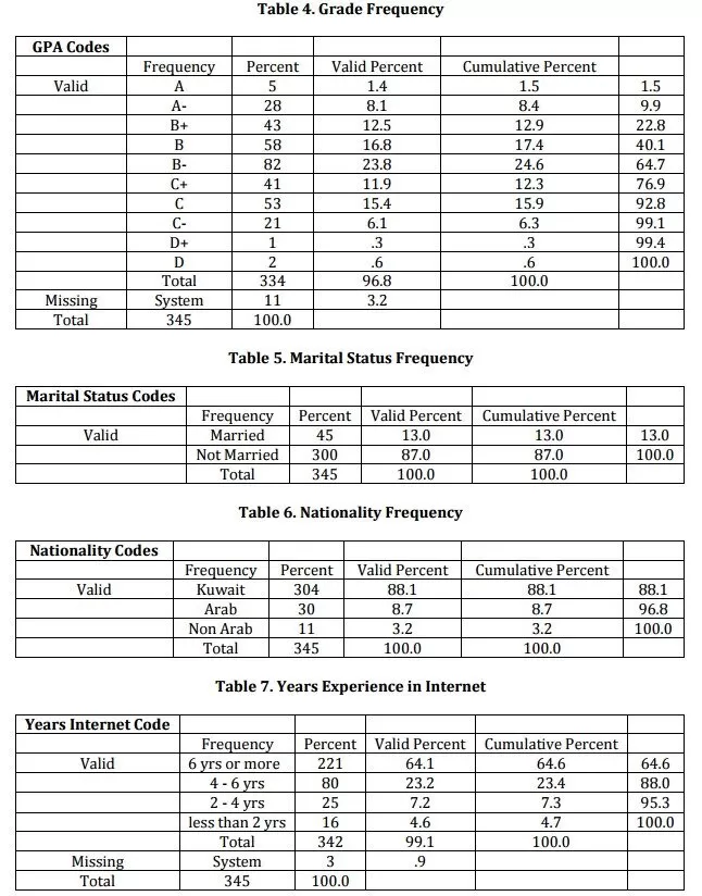 The majority of our students are female (258, 74.8%) (see Table 1). Most subjects age in the sample are in the range between 18 and 24 (290, 84.2%) (see Table 2). There are around 15 colleges in Kuwait University (see Table 3 for student distribution among colleges). The majority of our sample belongs to B- grade (82, 24.6%) followed by the grade B (58, 16.8%) (see Table 4 for students grades distribution and frequency). Almost 90 percent of the study sample is not married (300, 87%) (see Table 5 for marital status). Around 65 percent of our sample size uses the Internet for more than 6 years (221, 64.6%), followed by the group of 4 – 6 years, which reflects that the Internet is a high demand by this sector of the Kuwaiti society due to their life commitments as being in the academia lifestyle (see Table 7 for more frequencies on Internet experience).