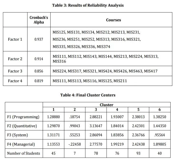 Kaiser-Meyer-Olkin (Kaiser, 1970) measure of sampling adequacy gives a value of 0.846, Bartlett’s test sphericity has a chi-square value of 1467. With 435 degrees of freedom, this has a p value of 0.000. Both of these statistics indicate that the data set is suitable for factor analysis. There are four factors whose Eigen values exceed unity that explain 63% of the total variance in the data set. Considering the description of the required courses in MIS department given in Table 1 and the rotated factor (component) loading matrix presented in Table 2 reveals that factor 1 consists of programming courses. Factor 2 basically contains quantitative courses such as mathematics, statistics as well as the two introductory economics courses. Factor 3 collects the courses that require system thinking and design ability of students. Finally, factor 4 includes managerial courses such as marketing and organizational behavior. The reliability of these four factors is examined by computing the Cronbach’s alpha values individually. The Cronbach’s alpha values shown in Table 3 indicate that factors 1 to 4 are all reliable.