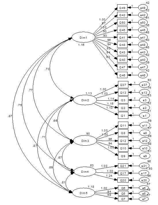 Prior to evaluate the fitting model, we defined a measurement model to verify that the 26 measurement variables are reflecting to five unobserved construct (Dim1, Dim2, Dim3, Dim4 and Dim5). To define the three measurements, i.e. the degree of model-fit, the adequacy of the factor loadings, and the standardized residuals and explained variances for the measurement of the said 26 items, we used the confirmatory factor analysis (CFA). All factors were set for a freed loading (i.e. estimated). It means that the items are allowed to load on only one construct (i.e. no cross loading), and the latent constructs (five items) were allowed to correlate (equivalent to oblique rotation in exploratory factor analysis).