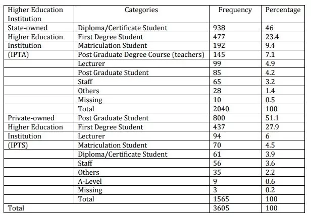 For normality testing, all cases (3927) were processed. In first screening, it deleted 50 cases, i.e. four cases because of incomplete information and 46 cases because of not comply with research target population (never use the library for the past six month). The following screening found that 253 were invalid data due to missing value. After passing those screening, an exploratory factor analysis was conducted (from 3824 data). From this step, nineteen (19) cases were deleted and finally, the valid data were equal to 3605. The skewness and kurtosis have been tested to check the normality. The result shown than the maximum value is 1.9 and the minimum is 1.35. These values showed that the data was in normal distribution.