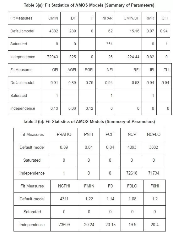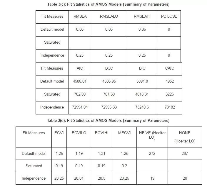 The following tables [Tables 3(a), 3(b), 3(c) and 3(d)] are taken directly from AMOS output. Each table showed three models. First, it is the default model (the hypothesized model). Second, there is the saturated model (is an extreme model), where in which the number of estimated parameters equals the number of data points, i.e. variances and co-variances of the observed variables, as in the case of the just-identified model) and the least constricted. Finally, it is the independence model that it is one of a complete independence of all variables in the model, in which all correlations among variables are zero, and it is the most restricted.