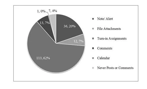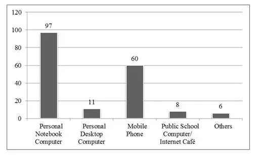 Respondents’ profiles and their usage preferences were analysed by descriptive statistics: frequency and percentage. Of 182 participants, 133 students (73.1%) are female and 49 students (26.9%) are male. Most repeatedly used features of Edmodo are turn-in assignments (62%), note/alert (20%), comments (7%), attachments (7%), never posts or giving comments (4%), and calendar (1%) respectively, as shown in Figure 1. Figure 2 presents main access devices to use Edmodo are personal notebook computers (53.3%), mobile phones (32.97%), personal desktop computers (6.04%), and public school computers or internet cafes (4.4%), and other devices (3.3%).